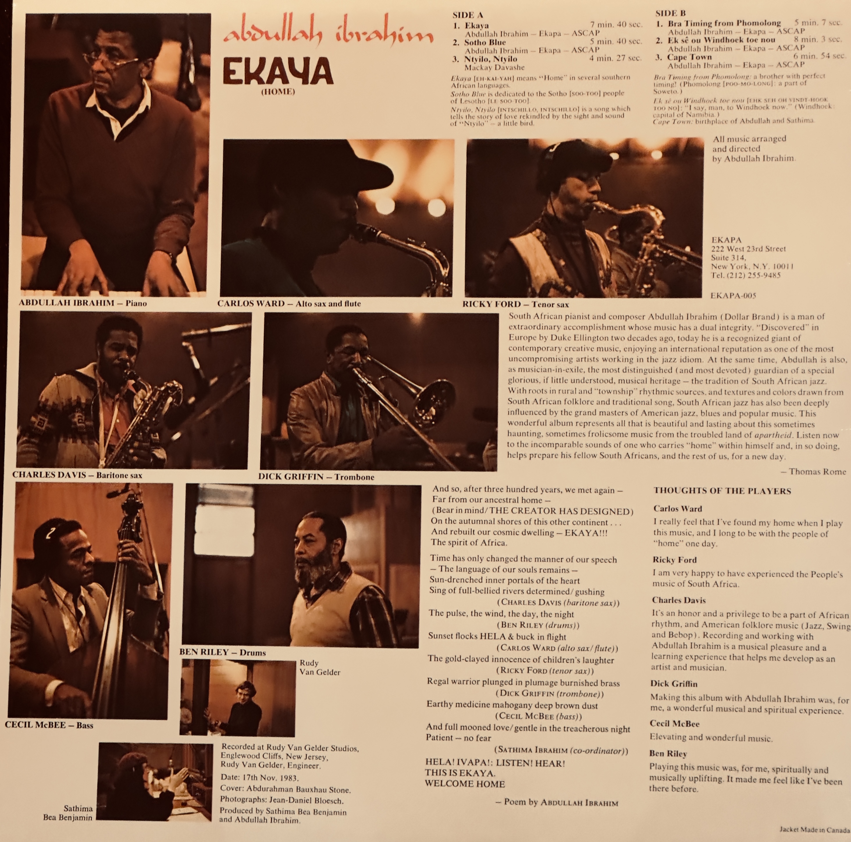 But not even Abdullah Ibrahim could have predicted what was about to happen when he visited Cape Town to record music in 1974. During a break between scheduled recording at a studio, he started improvising a tune on a piano, with no score and no prior rehearsal with the band. This band consisted of Abdullah Ibrahim (piano), Paul Michaels (bass), Monty Weber (drums), Basil Coetzee (tenor saxophone & flute), and Robbie Jansen (alto saxophone). The tape was rolling when Ibrahim started playing. The bassist joined in, then the drummer, then the alto saxophonist, followed by the tenor saxophonist whose long solo brought the theme together and spoke a wordless protest declaring a resolute resistance to the injustice.